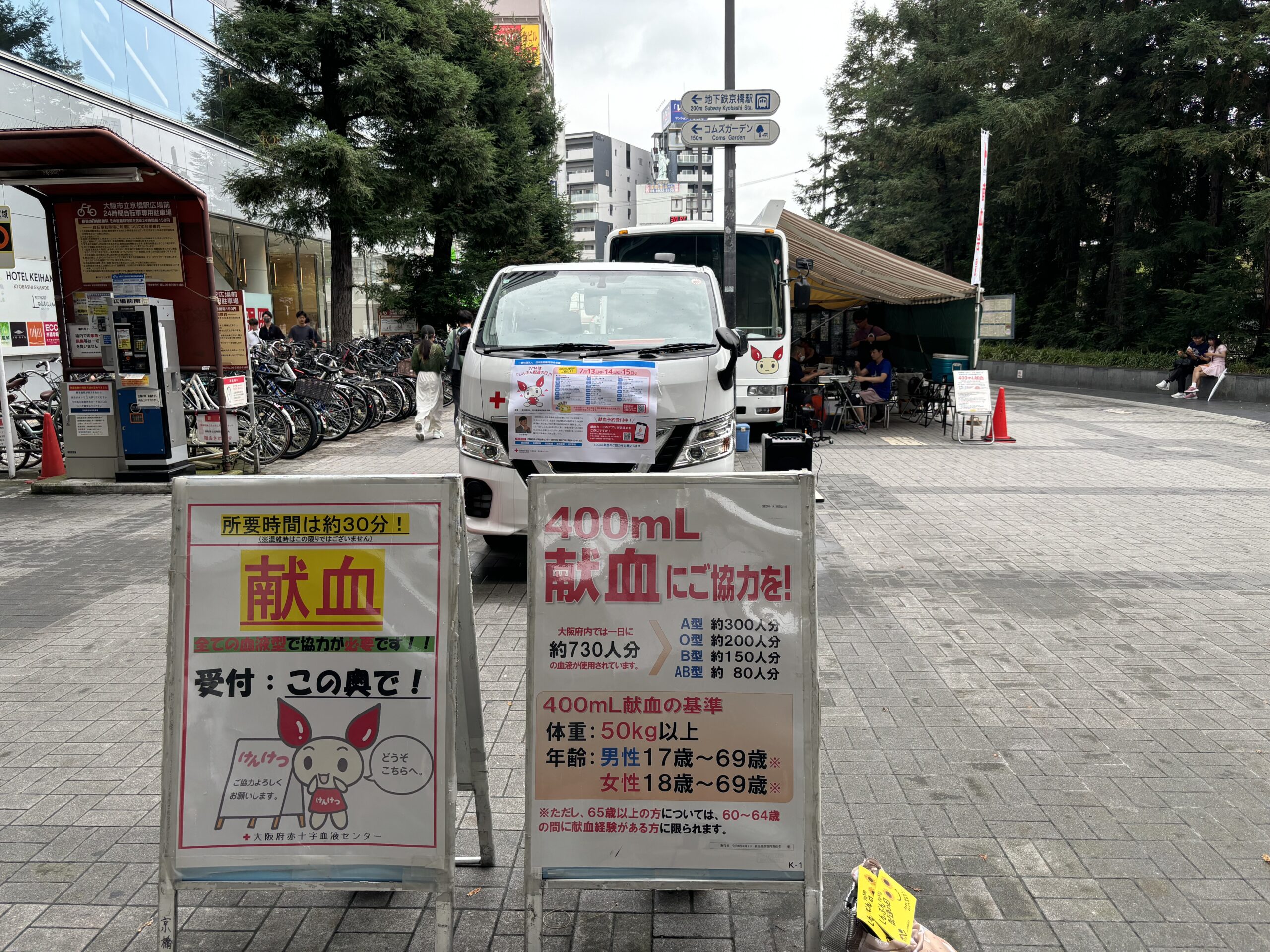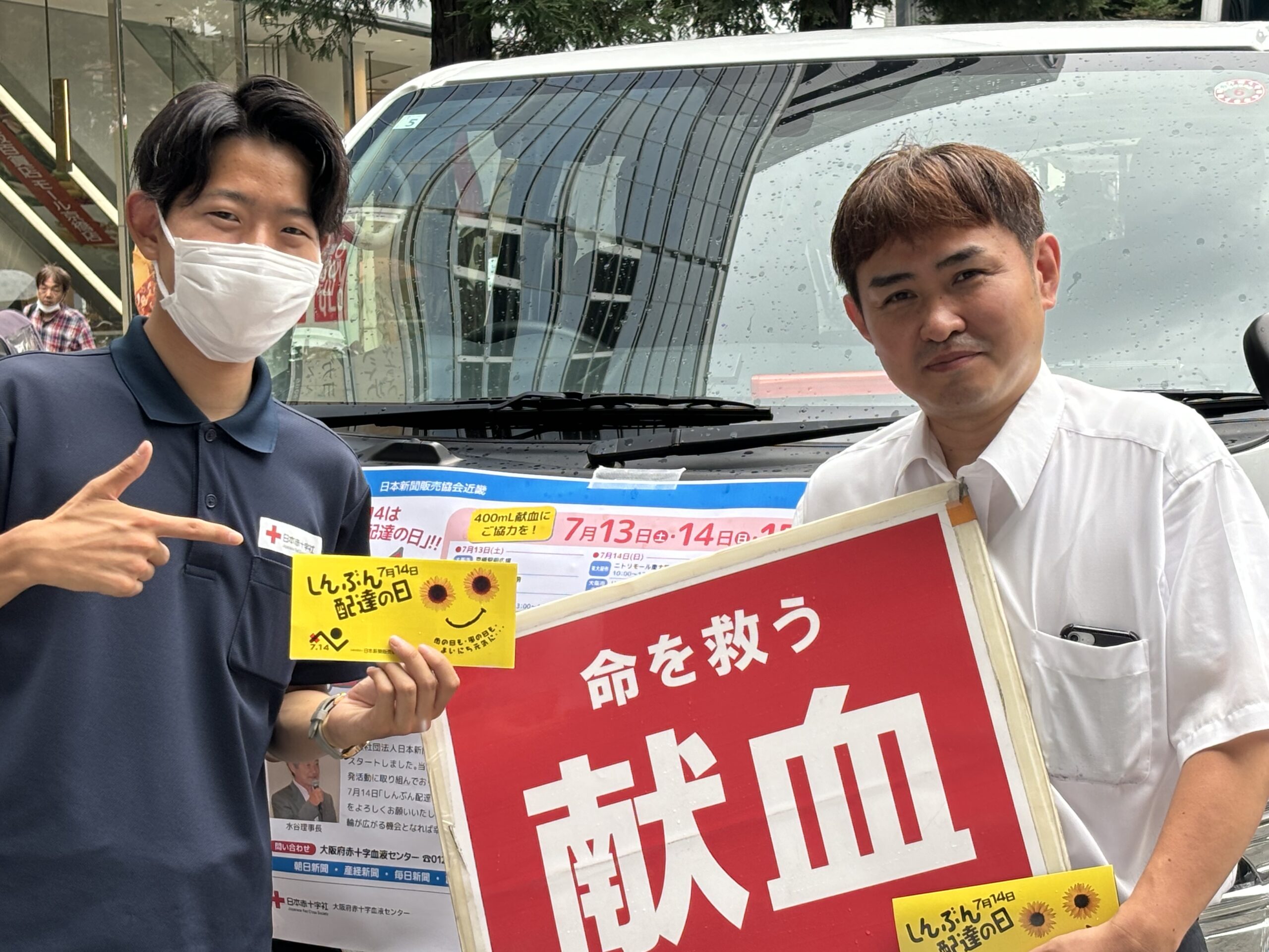 7月14日の「しんぶん配達の日」に合わせ、(一社)日本新聞販売協会近畿では、大阪府内4支部(大阪市連合/大阪府北部/大阪府中部/大阪府南部)の協力で、大阪府赤十字血液センターに協力して献血を呼びかけるキャンペーンを実施しました。